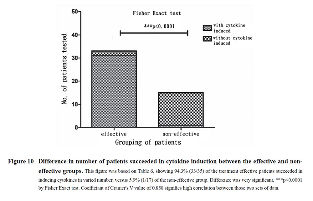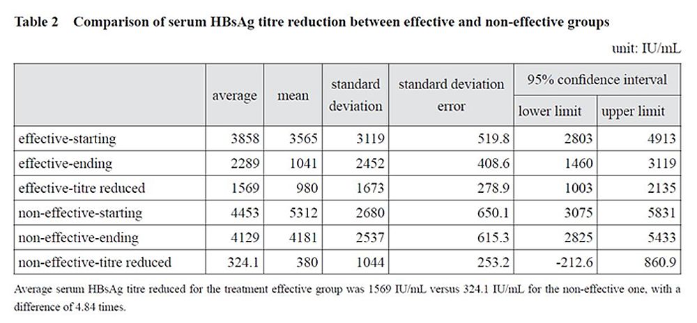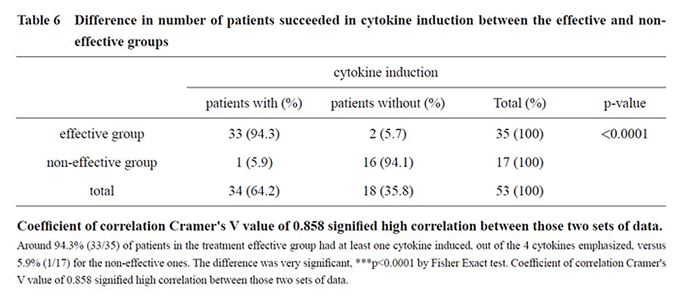 二、 | 臨床統計證實了TCM治療慢性B型肝炎與帶原確實有效,能達致HBsAg血清轉陰的治療終點。但是,其機制是甚麼呢?值得探討以服人! 準此,台灣長庚大學中醫系楊賢鴻主任、台灣衛生福利部國家中醫藥研究所研究員兼臨床組沈郁強組長與本中心陸庭譯中醫師攜手合作,依據本中心2016年9月4日至2018年9月24日符合研究條件而志願參加本計畫的慢性B型肝炎與帶原者共57人,其中:有效組36人,無效組17人,進行臨床實驗,檢測其IFN-α,IFN-γ,TNF-α及TGF-β1四種內源性細胞因子的誘生,以及做臨床統計。 於2018年4月間進行的臨床實驗證實94.3%(33/35)的有效組成員誘生了IFN-α,IFN-γ,TNF-α及TGF-β1四種內源性細胞因子中至少一種,而無效組17人中,僅5.9%(1/17)誘生了一種細胞因子,差異非常顯著(p<0.0001 by Fisher Exact Test),而這2組資料高度相關(Cramer´s V value-0.858),詳如下表與圖。 在血清HBsAg下降方面,有效組平均降低1,569 IU/mL,無效組僅324.1 IU/mL,統計差異顯著,詳下表與下圖: 由楊主任、沈組長與陸庭譯醫師共同具名發表的英文論文《Induction of Endogenous Cytokines by Traditional Chinese Medicine Leading to Reduction of Serum HBsAg Levels》請參閱中醫藥雜誌 J. Chin. Med. 31(1):66-83, 2020。 |