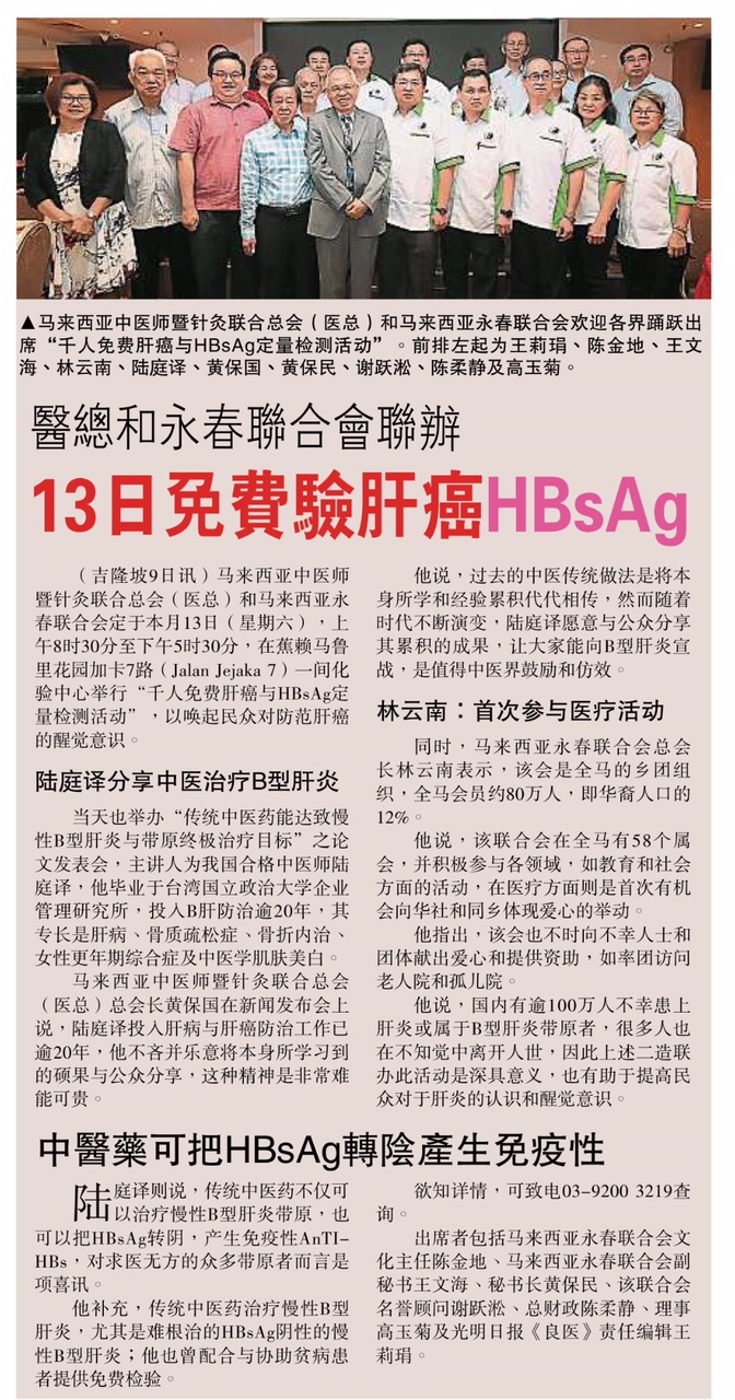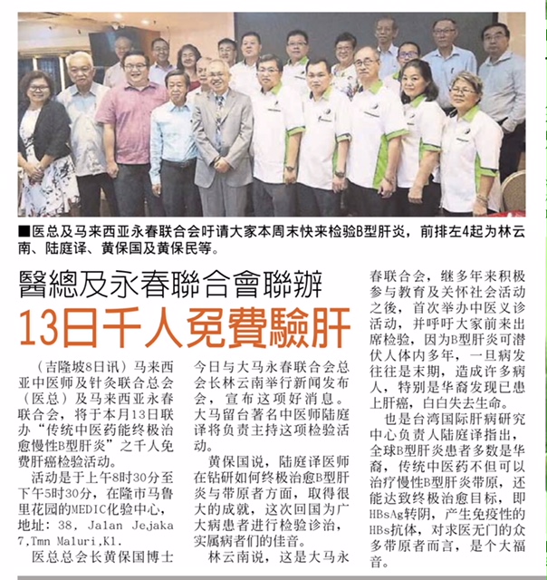 我要洽詢陸庭譯中醫師劍及履及,於2018年1月13日與馬來西亞中醫師暨針灸聯合總會(醫總)及馬來西亞永春聯合會聯辦千人免費肝癌與HBsAg定量篩檢活動,以實際行動勸導B肝族必須定期追蹤檢驗,以免確診時為時已晚的悲劇不斷發生。