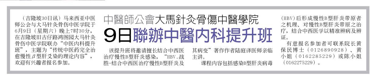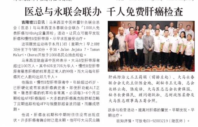於2018年10月4日、13日、21日馬來西亞醫總、檳榔嶼中醫學院及馬來西亞永春聯合會,分別在檳城、吉隆坡及新山舉行B肝防治講座會與肝癌及HBsAg免費定量篩檢活動,反應熱烈。