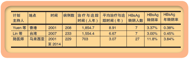 由於核苷(酸)類似物對HBV的作用重點在抑制HBV-DNA之逆轉錄,而非直接針對cccDNA,因此,對降低HBsAg並使它轉陰的療效,遜於兼具抗HBV與一些免疫調節功能的干擾素。但幹擾素,包括長效幹擾素,對降低華人HBsAg的療效亦不理想,有如下表所載在香港與臺灣所做過的臨床試驗結果顯示: